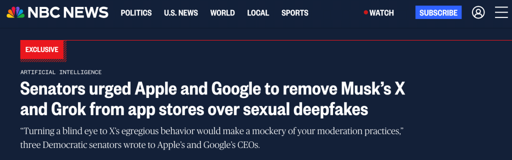 The Hill: U.S. lawmakers have also joined this chorus of voices. Sens. Ron Wyden (D-Ore.), Ben Ray Luján (D-N.M.) and Ed Markey (D-Mass.) wrote to Apple and Google on Friday, asking the tech giants to remove X and Grok from their respective app stores.